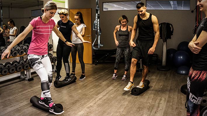 Praktisch trainieren wir dabei auf stabilen und instabilen Unterlagen oder bringen den Körper in instabile Positionen, wie ein Ein-Beinstand oder eine Standwaage. Die Intensität ist im Gegenteil zu normalen Krafttraining gering und liegt zwischen 15 – 40 % des 1 RM. Als Hilfsmittel oder zur Steigerung der Intensität können Gymnastikbälle, Balanceboards, Bosu-Bälle, TRX u.v.m. verwendet werden.
